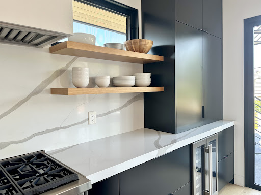 One of the standout features of this remodel is the custom cabinetry. Built in our Anaheim manufacturing facility, these cabinets were designed with a clean, minimalist style and finished in a soft neutral tone that reflects natural coastal light. The result is a bright and inviting kitchen that feels open and uncluttered.
