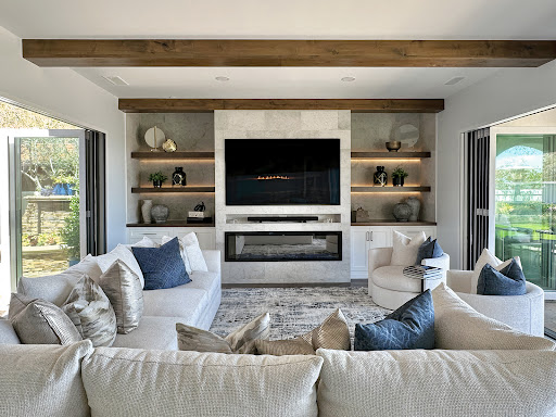 To add both beauty and function, we incorporated custom built-in shelving and cabinetry around the fireplace. These built-ins provide space for books, décor, and media components while helping the room feel more tailored and organized.